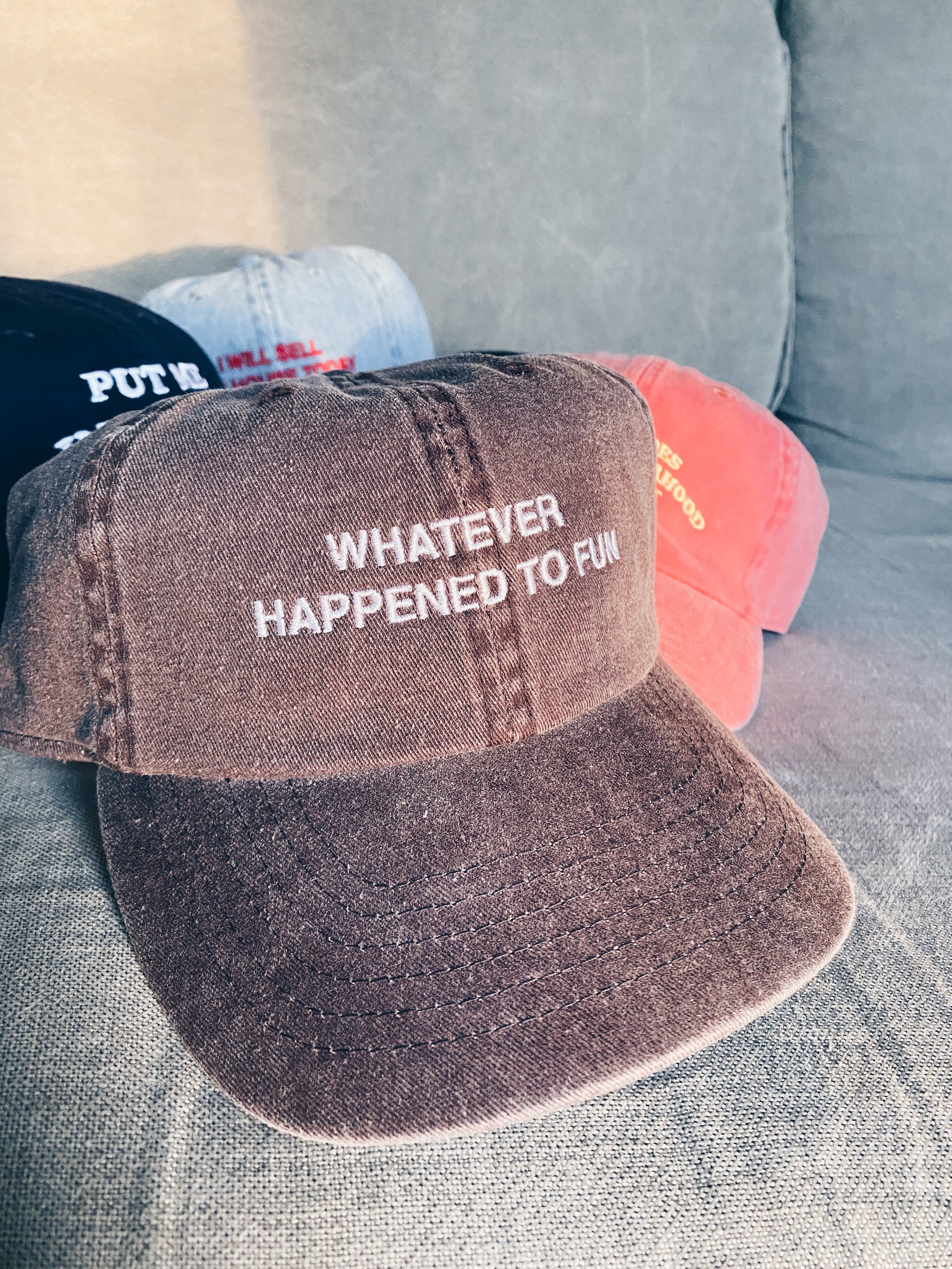 Whatever Happened to Fun Hat Inspired by the unforgettable moments that define a life well-lived, this hat captures that carefree, adventurous spirit of embracing the unexpected. It's for anyone who knows that the best stories come from saying yes, taking chances, and refusing to play it safe. Wear it as a tribute to living boldly and finding humor in life's wildest turns. Because sometimes the most memorable moments are the ones you never saw coming.